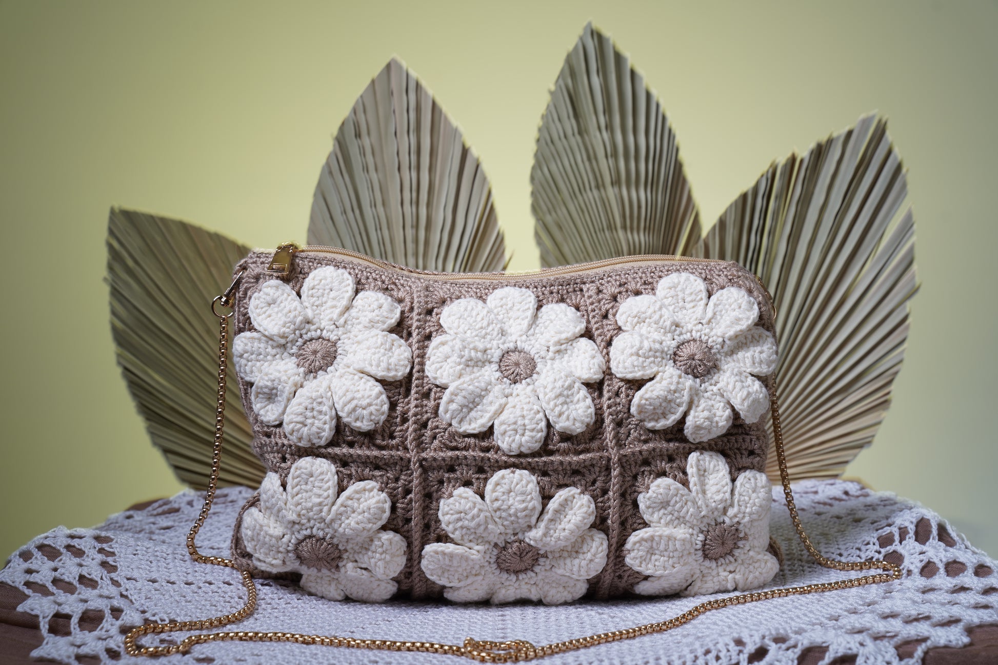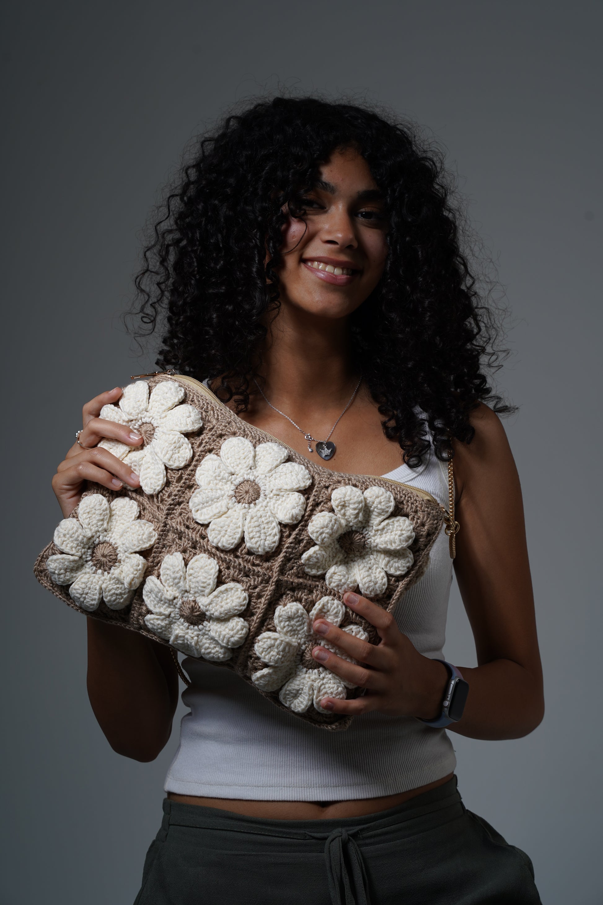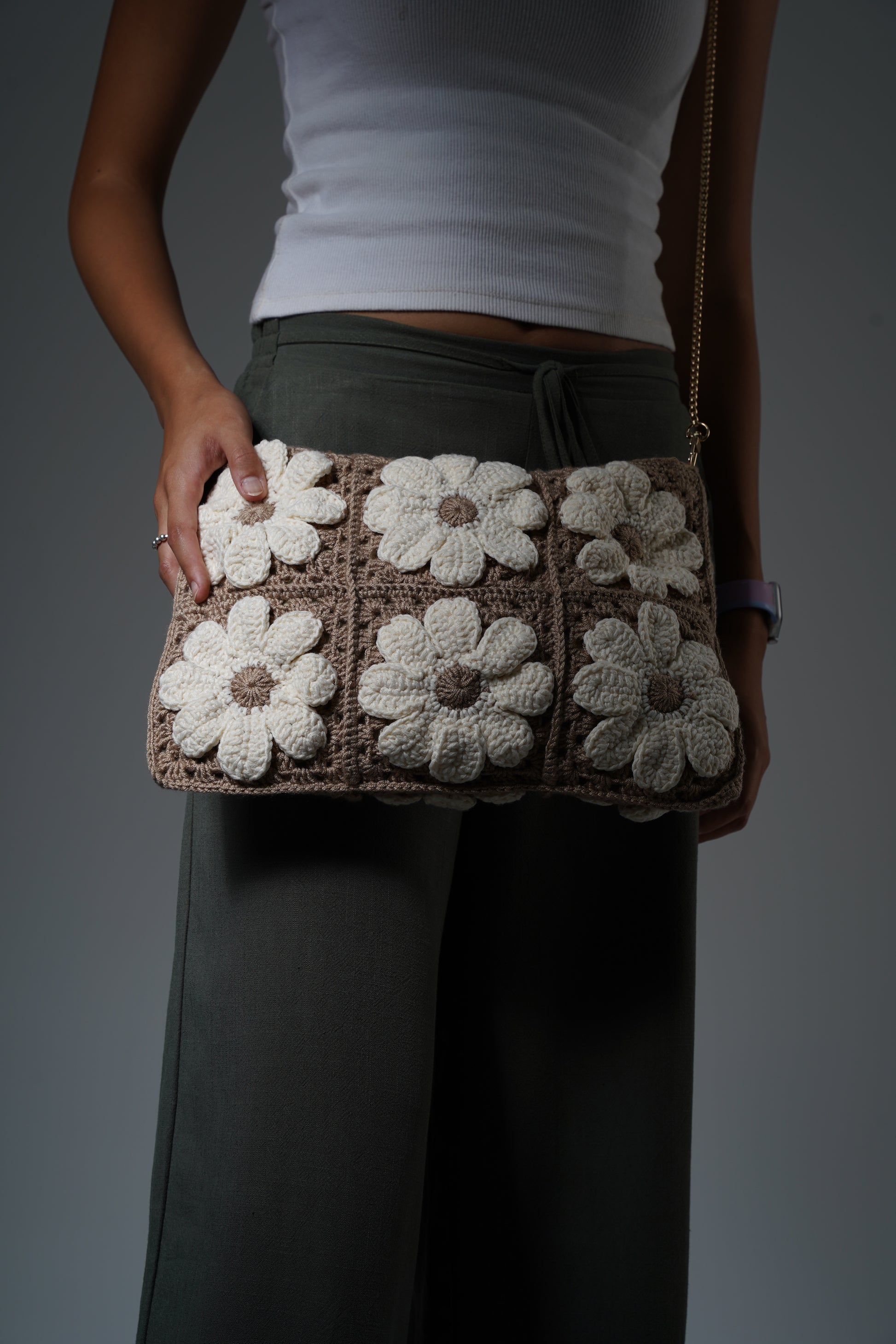 Bloom - A handmade crochet bag crafted from soft yarn, featuring a grid of large, 3D cream flowers. vintage-inspired look with a modern twist.