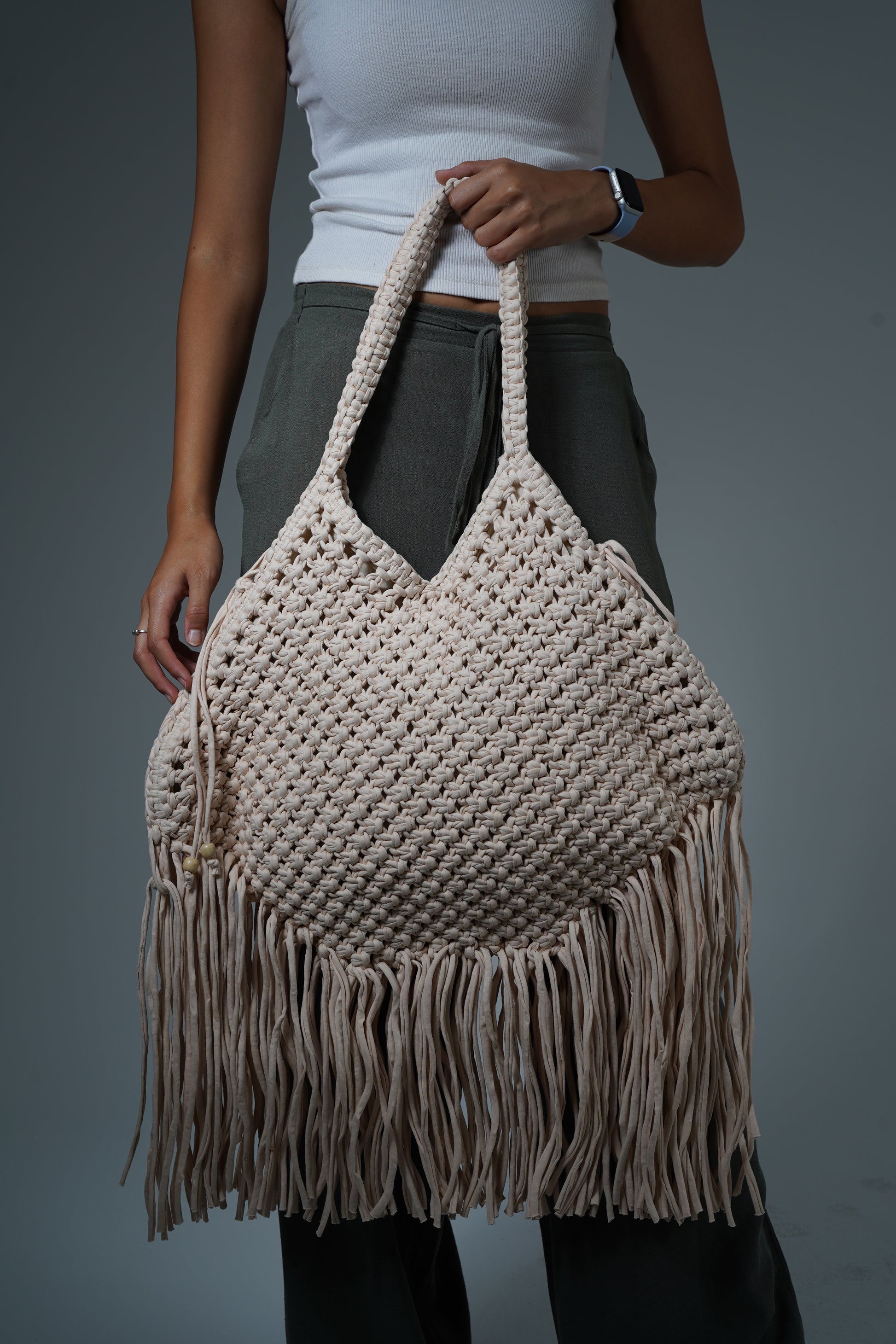 Luna - this handmade crochet tote in beige features a chunky texture and long fringe for a laid-back, bohemian feel. Spacious, stylish, and made to move with you.