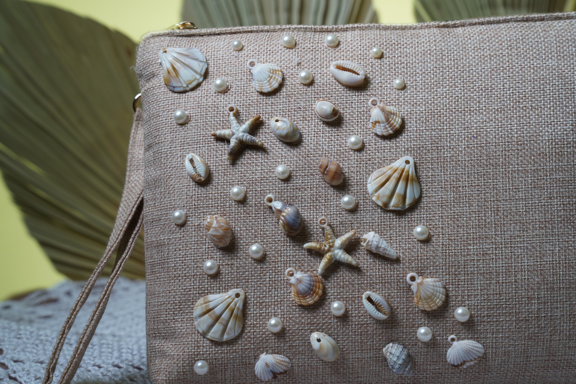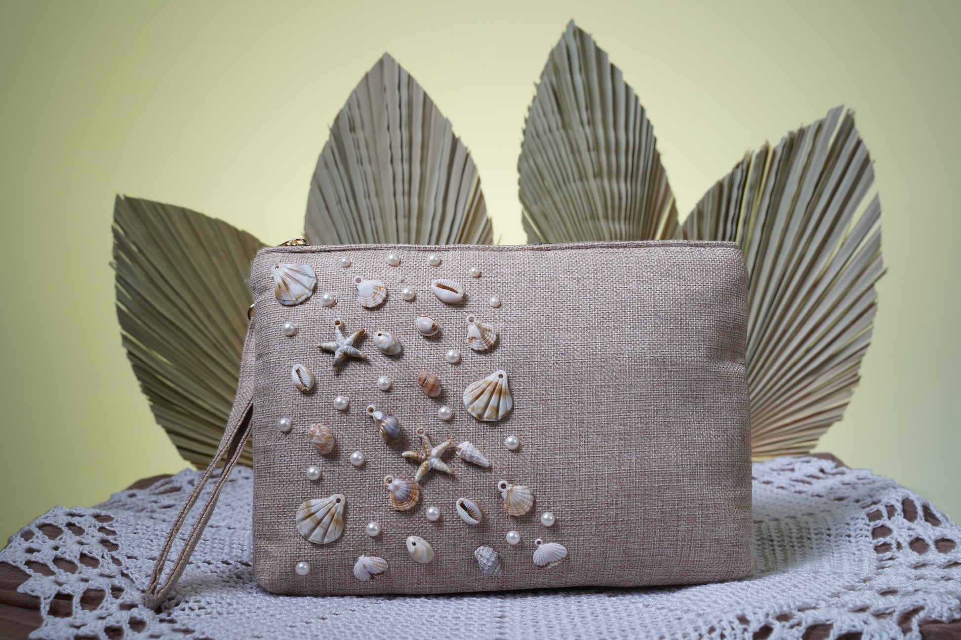 our clutch with seashell and pearl embellishments, giving it a charming coastal touch