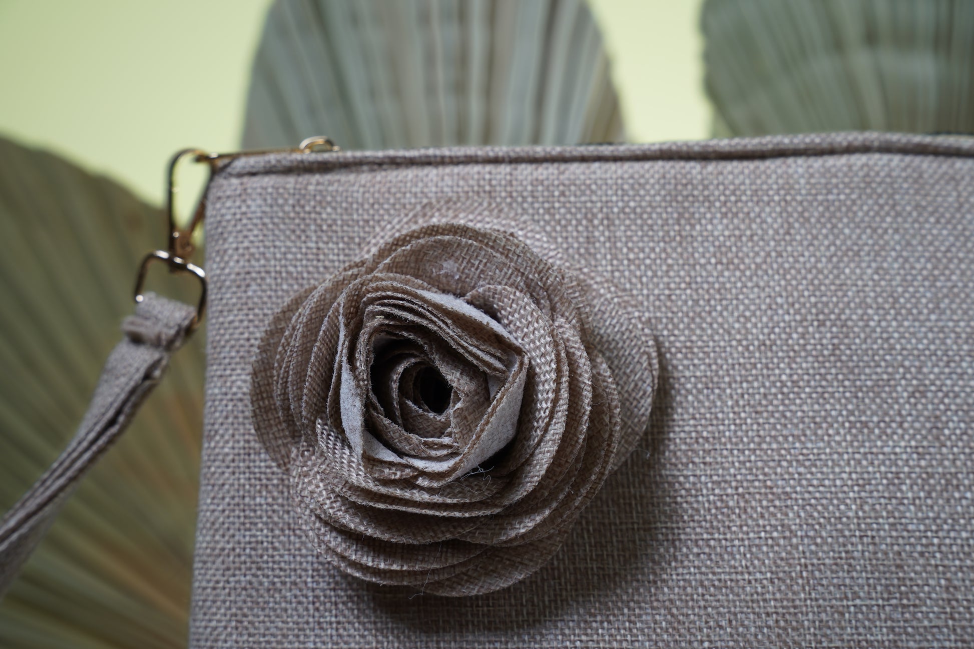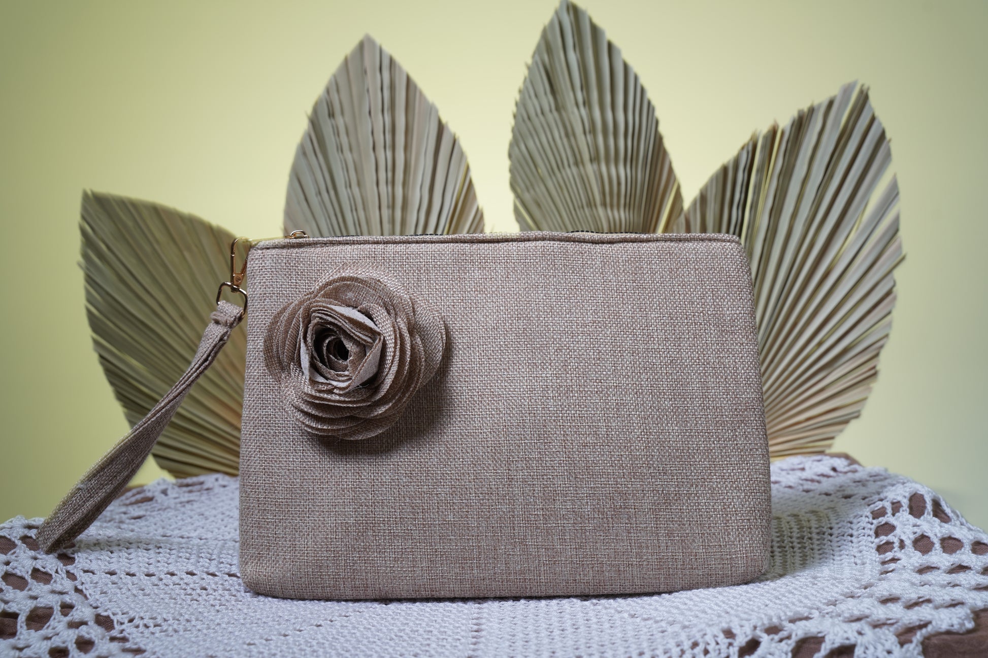 Tula - this timeless clutch is elevated with a handcrafted fabric rose. Perfect for garden parties, beach weddings, or adding a soft, feminine touch to your everyday look!
