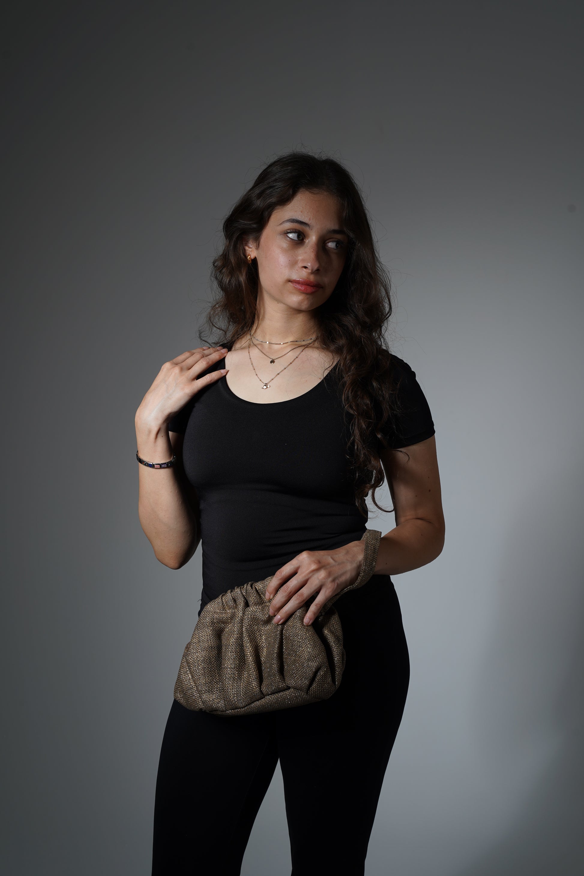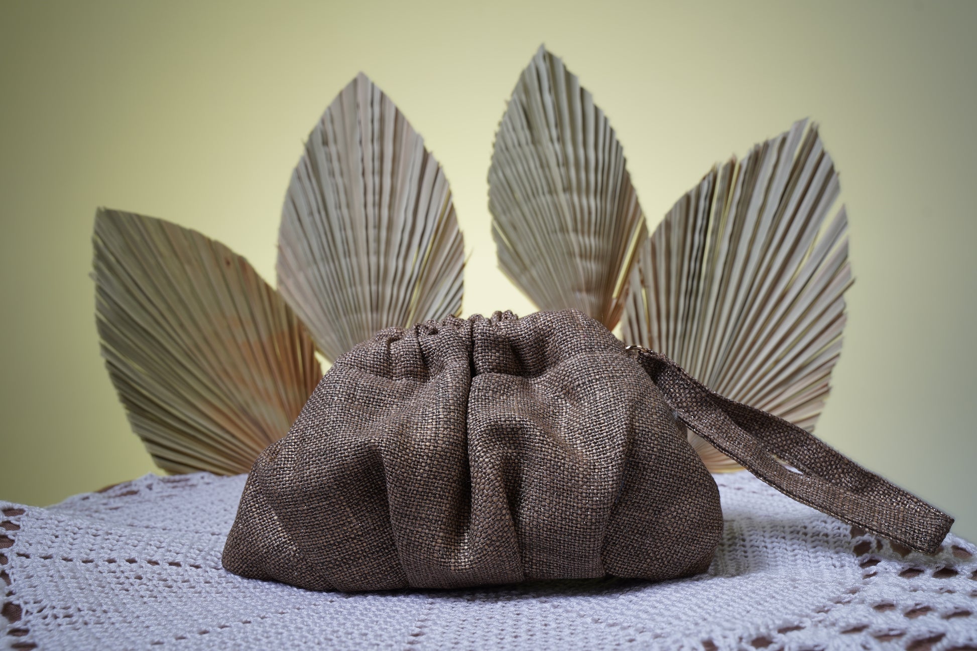 Veya - textured brown pouch with a gathered top and wrist strap. Roomy, lightweight, and effortlessly stylish.